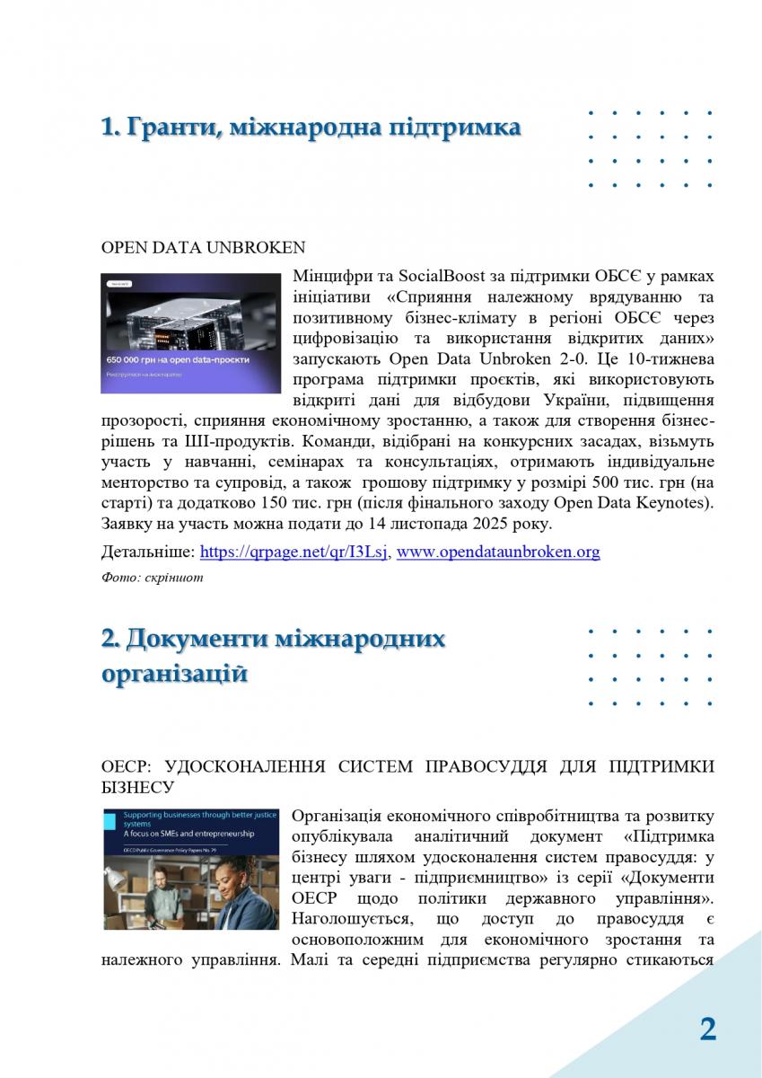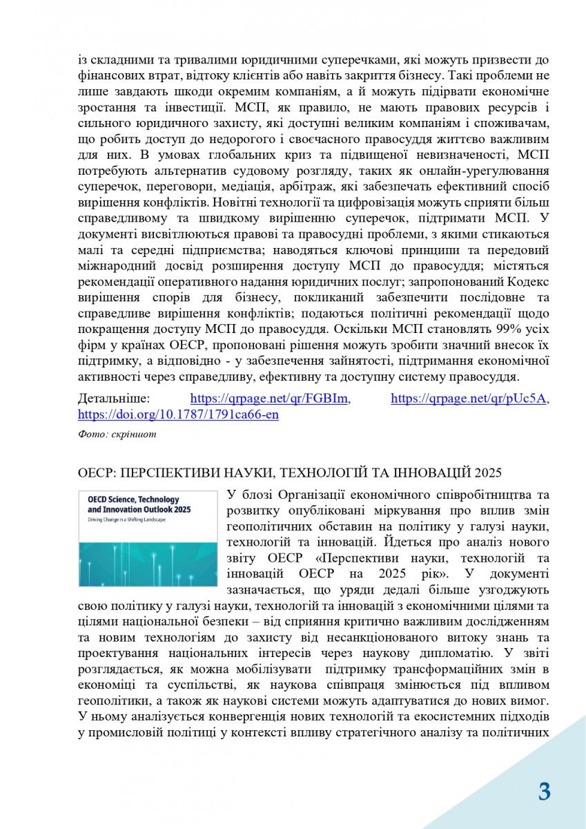 Вас можуть зацікавити публікації ОЕСР «Перспективи науки, технологій та інновацій ОЕСР на 2025 рік», «Підтримка політичних дій через державно-приватний діалог» та «Підтримка бізнесу шляхом удосконалення систем правосуддя: у центрі уваги – підприємництво».